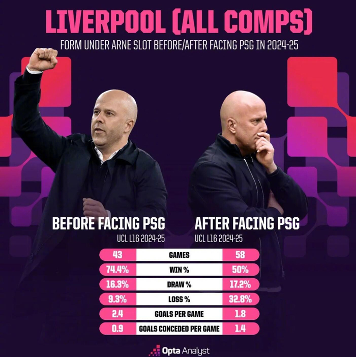 Opta Analyst统计显示,在上赛季欧冠1/8决赛遭遇巴黎之前,斯洛特上任后的利物浦在各项赛事前43场比赛中取得32胜7平4负,胜率高达74.4%,输球率仅为9.3%。